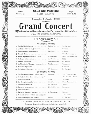 Voilà une ambition localiste bien clairement affichée, mais dont les effets seront relativement modestes quant au répertoire, si l’on en juge par les programmes de concert que l’on a retrouvé. Certes on y trouve des chants de Roland ou de Despourrins, mais pas de façon majoritaire et sans se priver ni du répertoire lyrique, ni des compositions orphéoniques, ni des chansons de variété de l’époque.